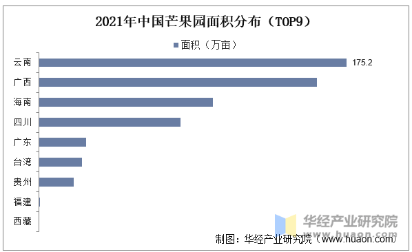 中国芒果产区次要分布正在云南、广西、海南、四川、广东、、贵州等地,此中,云南、广西、海南以及四川产区的芒果园面积较着跨越其他产区。2021年云南、广西、海南以及四川产区芒果园面积别离为175。2万亩、158。4万亩、99。3万亩、80。7万亩,正在全国芒果园面积中所占的比沉顺次为29。87%、27。01%、16。93%、13。76%。