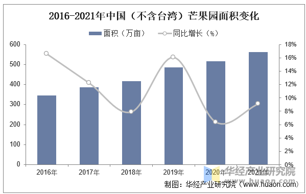 据农业农村部农垦局数据显示,2021年中国芒果园面积为561。9万亩,同比增加9。09%,取2016年的344。7万亩比拟,中国芒果园面积增加了217。2万亩。2016年至2021年,中国芒果园面积同比增加率从峰值波动下降至9。09%。