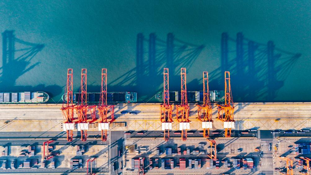 2025年1月13日,正在山东口岸青岛前湾港,拆载外贸集拆箱的货轮停靠船埠(无人机照片)。发(俞方平摄)。