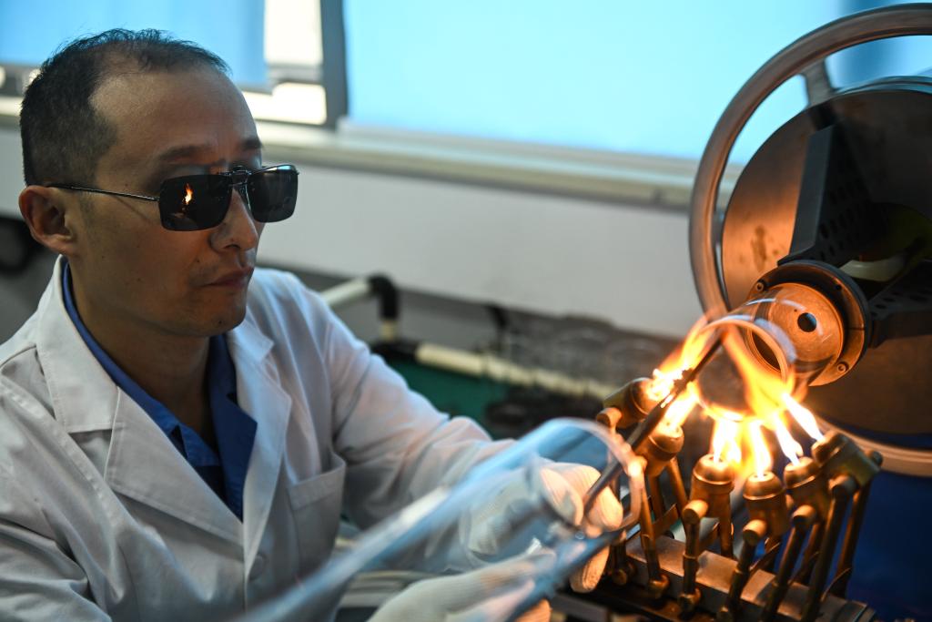 2024年9月24日,日联科技手艺人员烧制X射线管玻璃外壳。记者 季春鹏 摄。