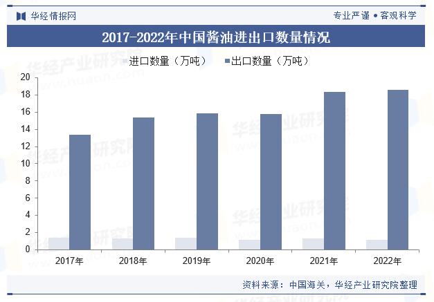 伴跟着全球化的推进,我国既是酱油的出产和消费大国,也是主要的出口国,正在酱油质量不竭提拔的布景下,越来越多的外国消费者起头对中国酱油发生乐趣,带动中国酱油行业的出口市场逐步扩大。2022年,中国酱油进口量为1。17万吨,出口量则是18。61万吨,同比增速别离为-13。3%、1。5%。