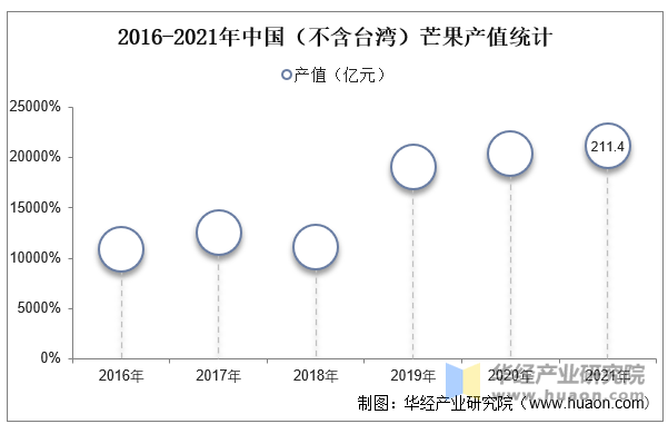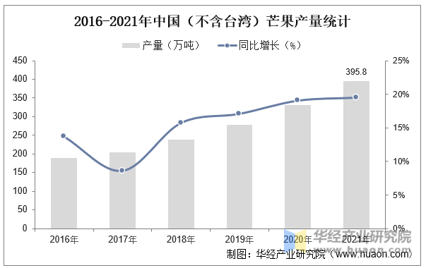 据农业农村部农垦局数据显示,2021年中国芒果园面积为561。9万亩,同比增加9。09%,取2016年的344。7万亩比拟,中国芒果园面积增加了217。2万亩。2016年至2021年,中国芒果园面积同比增加率从峰值波动下降至9。09%。