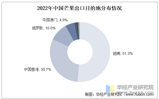 我国芒果次要出口至越南、中国、俄罗斯、中国澳门和新加坡等地,此中出口至越南和中国的数量跨越了1万吨,别离为1。93万吨和1。16万吨,占比别离为51。3%和30。7%。
